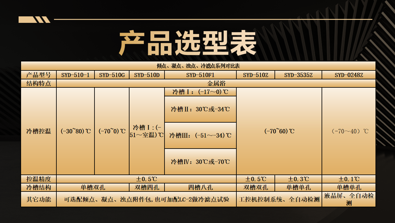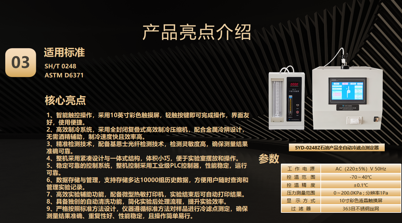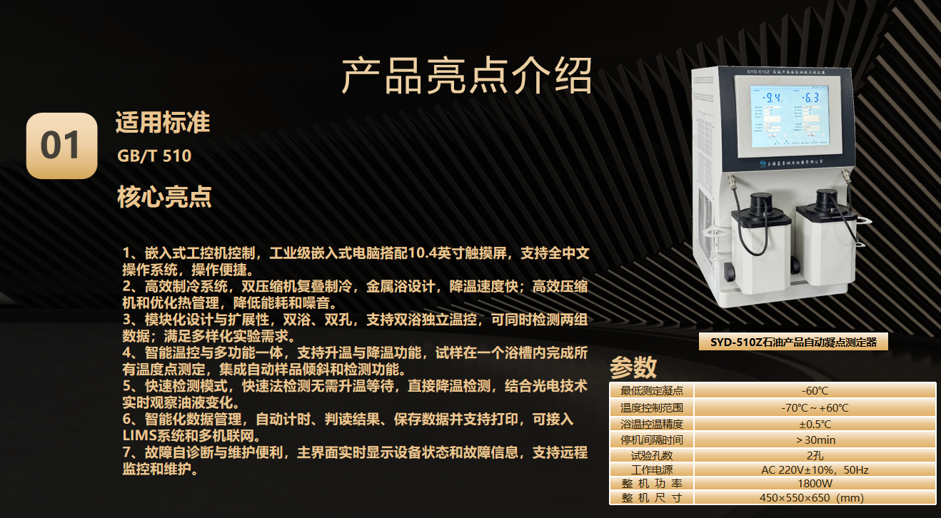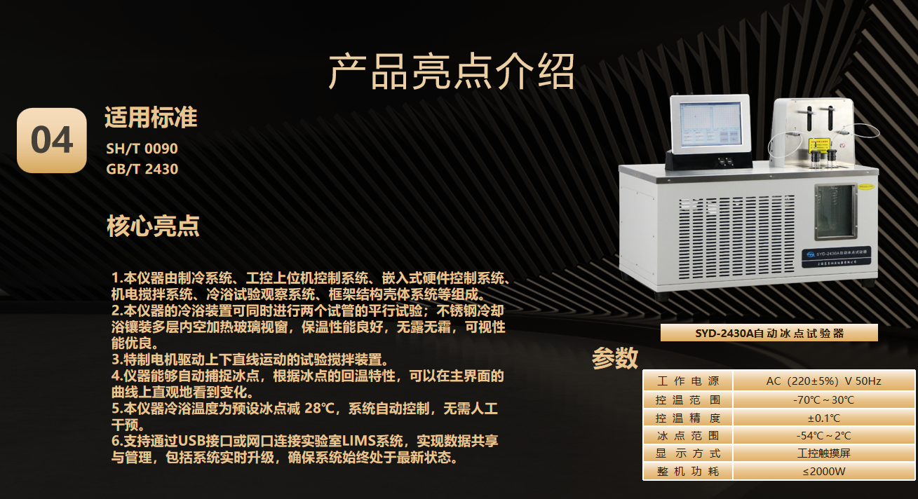 第一代(2010年) SYD-510G、SYD-510-1金屬浴結(jié)構(gòu) 第二代(2015年) SYD-510D雙槽四孔結(jié)構(gòu) ? 首創(chuàng)雙溫區(qū)獨立控制系統(tǒng) ,同步測試樣品量提升一倍 第三代(2020年) SYD-510F1四槽八孔金屬浴結(jié)構(gòu) 冷槽Ⅰ:-17℃~0℃; 冷槽Ⅱ:30℃或-34℃ 冷槽Ⅲ:-51℃~-34℃; 冷槽Ⅳ:30℃或-70℃ 第四代巔峰之作(2025年) SYD-510Z(凝點) SYD-3535Z(傾點、濁點) SYD-0248Z(冷濾點) 三款石油產(chǎn)品低溫流動性設(shè)備同步上市 1.SYD-510Z全自動凝點測定器:整合雙孔金屬浴測試模塊系統(tǒng),適用GB/T 510標(biāo)準(zhǔn),結(jié)合光電技術(shù)實時觀察油樣變化,準(zhǔn)確測定試樣的凝點。 2.SYD-3535Z全自動傾點濁點測定器,整合濁點/傾點雙測試模塊系統(tǒng),一機(jī)覆蓋GB/T 3535、GB/T 6986、ASTM D97、ASTM D2500等4項標(biāo)準(zhǔn)。 3. SYD-0248Z全自動冷濾點測定器,整合冷濾點主機(jī)/抽濾器雙模塊系統(tǒng),一機(jī)覆蓋SH/T0248、ASTM D6371兩項標(biāo)準(zhǔn) 適用標(biāo)準(zhǔn) GB/T 510 核心亮點 1、嵌入式工控機(jī)控制,工業(yè)級嵌入式電腦搭配10.4英寸觸摸屏,支持全中文操作系統(tǒng),操作便捷。 2、高效制冷系統(tǒng),雙壓縮機(jī)復(fù)疊制冷,金屬浴設(shè)計,降溫速度快;高效壓縮機(jī)和優(yōu)化熱管理,降低能耗和噪音。 3、模塊化設(shè)計與擴(kuò)展性,雙浴、雙孔,支持雙浴獨立溫控,可同時檢測兩組數(shù)據(jù);滿足多樣化實驗需求。 4、智能溫控與多功能一體,支持升溫與降溫功能,試樣在一個浴槽內(nèi)完成所有溫度點測定,集成自動樣品傾斜和檢測功能。 5、快速檢測模式,快速法檢測無需升溫等待,直接降溫檢測,結(jié)合光電技術(shù)實時觀察油液變化。 6、智能化數(shù)據(jù)管理,自動計時、判讀結(jié)果、保存數(shù)據(jù)并支持打印,可接入LIMS系統(tǒng)和多機(jī)聯(lián)網(wǎng)。 7、故障自診斷與維護(hù)便利,主界面實時顯示設(shè)備狀態(tài)和故障信息,支持遠(yuǎn)程監(jiān)控和維護(hù)。 GB/T 3535 GB/T 6986 ASTM D97 ASTM D2500 核心亮點 1、先進(jìn)微計算機(jī)控制技術(shù),試驗全過程的自動化完成,放樣后,無需人員隨機(jī)操作,一鍵完成傾點或者濁點檢測。測定集制冷、加熱于一體。 2、采用10寸彩色液晶觸摸屏,中文或者英文(定制)界面顯示,顯示直觀,操作簡單。 3、儀器具有自動降溫、自動傾斜(提升)測試、自動控溫等功能; 4、進(jìn)口復(fù)疊式壓縮機(jī)制冷系統(tǒng),制冷快,極限制冷溫度為-70℃。 5、采用日本進(jìn)口檢測裝置,可檢測到液面微小變化,檢測靈敏度高。 6、先進(jìn)的阱形冷浴箱,具有滯后性小、降溫快,檢測樣品等待時間短。 7,windows操作平臺,多種數(shù)據(jù)傳輸方式,WIFI藍(lán)牙數(shù)據(jù)連接。 8, 測試浴有自動預(yù)熱功能,用戶可以自行設(shè)置是否預(yù)熱、預(yù)熱時間及預(yù)熱溫度; 9,儀器具有浴溫校正、具有強(qiáng)大的數(shù)據(jù)存儲查詢功能。儀器可存儲上千條試驗結(jié)果,可查詢試驗結(jié)果。 適用標(biāo)準(zhǔn) SH/T 0248 ASTM D6371 核心亮點 1、智能觸控操作,采用10英寸彩色觸摸屏,輕觸按鍵即可完成操作,界面友好,使用便捷。 2、高效制冷系統(tǒng),采用全封閉復(fù)疊式高效制冷壓縮機(jī),配合金屬冷阱設(shè)計,無需酒精輔助,制冷速度快且效率高。 3、精準(zhǔn)檢測技術(shù),配備基恩士光纖檢測技術(shù),檢測靈敏度高,確保測量結(jié)果準(zhǔn)確可靠。 4、整機(jī)采用緊湊設(shè)計與一體式結(jié)構(gòu),體積小巧,便于實驗室擺放和操作。 5、穩(wěn)定可靠的控制系統(tǒng),整機(jī)控制采用工業(yè)級PLC控制器,性能穩(wěn)定,運行可靠。 6、數(shù)據(jù)存儲與管理,支持存儲多達(dá)10000組歷史數(shù)據(jù),方便用戶隨時查詢和管理實驗記錄。 7、高效實驗輔助功能,配備微型熱敏打印機(jī),實驗結(jié)束后可自動打印結(jié)果。 8、具備獨創(chuàng)的自動清洗功能,簡化實驗后處理流程,提升實驗效率。 9、嚴(yán)格按照標(biāo)準(zhǔn)方法設(shè)計,儀器遵循標(biāo)準(zhǔn)方法對樣品進(jìn)行冷濾點測定,確保測量結(jié)果準(zhǔn)確、重復(fù)性好、性能穩(wěn)定,且操作簡單易行。 適用標(biāo)準(zhǔn) SH/T 0090 GB/T 2430 核心亮點 1.本儀器由制冷系統(tǒng)、工控上位機(jī)控制系統(tǒng)、嵌入式硬件控制系統(tǒng)、機(jī)電攪拌系統(tǒng)、冷浴試驗觀察系統(tǒng)、框架結(jié)構(gòu)殼體系統(tǒng)等組成。 2.本儀器的冷浴裝置可同時進(jìn)行兩個試管的平行試驗;不銹鋼冷卻浴鑲裝多層內(nèi)空加熱玻璃視窗,保溫性能良好,無露無霜,可視性能優(yōu)良。 3.特制電機(jī)驅(qū)動上下直線運動的試驗攪拌裝置。 4.儀器能夠自動捕捉冰點,根據(jù)冰點的回溫特性,可以在主界面的曲線上直觀地看到變化。 5.本儀器冷浴溫度為預(yù)設(shè)冰點減 28℃,系統(tǒng)自動控制,無需人工干預(yù)。 6.支持通過USB接口或網(wǎng)口連接實驗室LIMS系統(tǒng),實現(xiàn)數(shù)據(jù)共享與管理,包括系統(tǒng)實時升級,確保系統(tǒng)始終處于最新狀態(tài)。 ? 智能檢測識別系統(tǒng);實現(xiàn)樣品裝載→極速降溫→數(shù)據(jù)判定→報告生成全無人值守 ? 金屬浴控溫系統(tǒng);金屬浴結(jié)構(gòu),進(jìn)口復(fù)疊式壓縮機(jī)制冷,制冷效率高,控溫精準(zhǔn),極限制冷溫度達(dá)