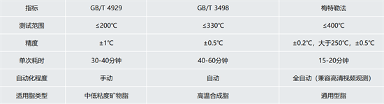 1. 梅特勒法(SYD-2806MA半自動、SYD-2806MB自動或半自動) 設(shè)備:全自動或半自動滴點(高清視頻觀測) 優(yōu)勢:兼容GB/T、ISO、ASTM等多項標(biāo)準(zhǔn),支持在高達(dá)400°C(±0.2℃,大于250℃±0.5℃)的溫度下同時測量兩個樣品,自動化控制升溫速率自動判斷試樣滴點,節(jié)省時間和人力成本;具有快速加熱和冷卻功能,提升實驗效率,縮短實驗周期。 03 三、選型建議(按應(yīng)用場景) 1. 常規(guī)質(zhì)檢(成本優(yōu)先) 選GB/T 4929,適用于礦物油基潤滑脂的出廠檢驗。 2. 高溫/合成潤滑脂研發(fā) 選GB/T 3498或梅特勒法,確保高溫數(shù)據(jù)準(zhǔn)確性(如航空航天潤滑脂)。 3. 高精度實驗室(效率優(yōu)先) 選梅特勒法設(shè)備,支持全自動測試,效率高,減少人為誤差。 4. 國際標(biāo)準(zhǔn)兼容性需求 梅特勒法優(yōu)先,滿足出口產(chǎn)品認(rèn)證要求。